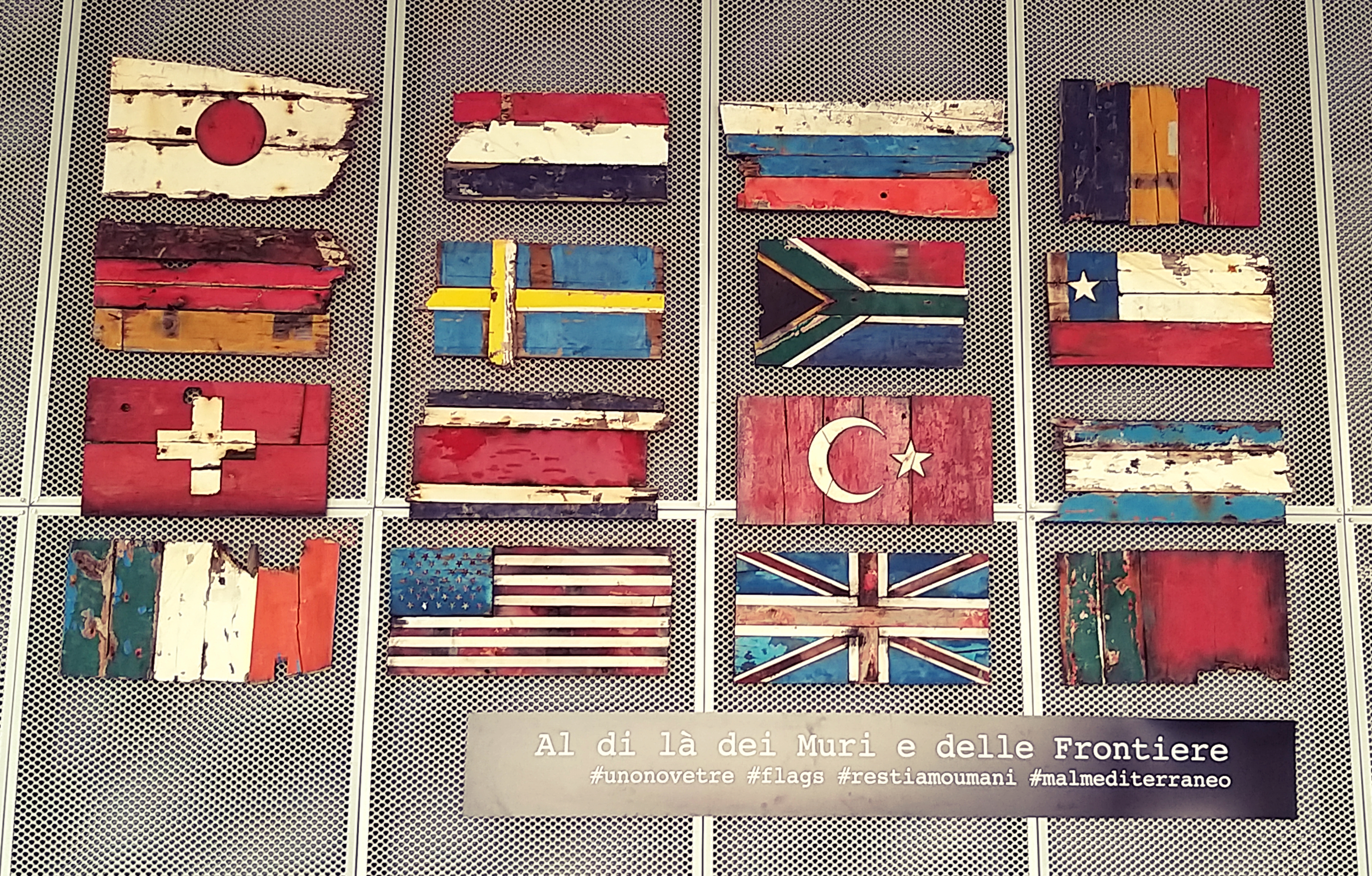 Nel piccolo aeroporto di Pantelleria è esposta un’opera costruita con pezzi di imbarcazioni, sui quali sono dipinti i colori di diverse bandiere. “Al di là dei Muri e delle Frontiere”, recita la targa, dando così un bellissimo messaggio di benvenuto e di arrivederci ai viaggiatori.