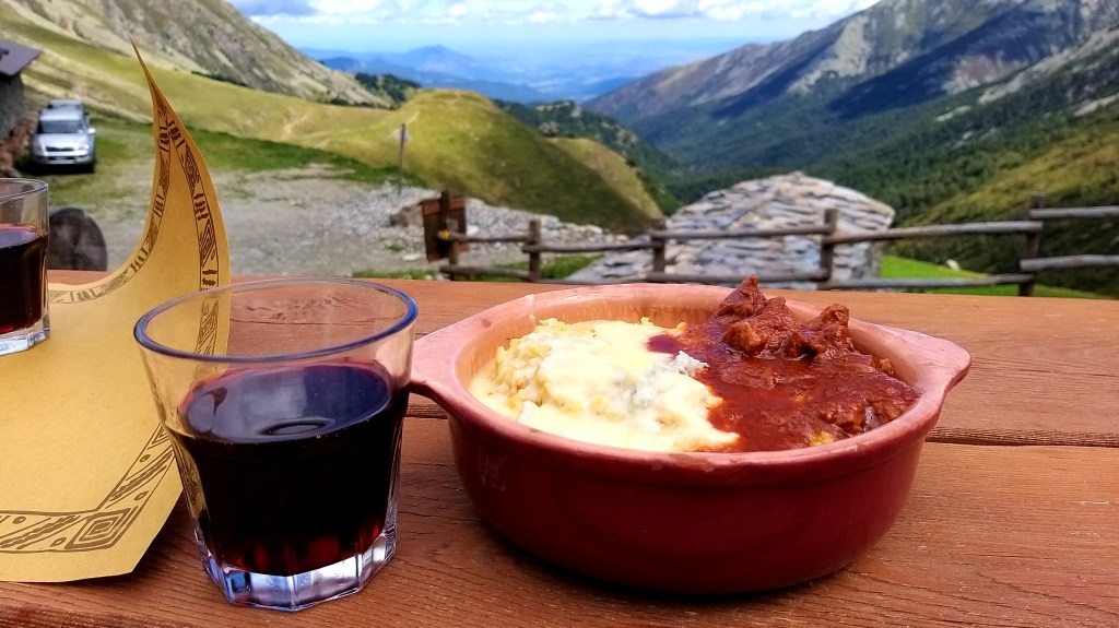- Muoversi solo con la certezza di una meta culinaria: polenta concia, con spezzatino, salsiccia, magari un bel tagliere con salumi e affettati locali e, perché no, un po’ di vinello per scaldare il cuore. E poi giù…rotolando per il pendio con la pancia piena;