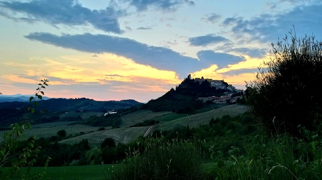 Sulla via del ritorno abbiamo scorto, immerso nelle luce del tramonto, un piccolo borgo arroccato su una collina. Abbiamo deciso così di raggiungerlo e ci siamo ritrovati nel grazioso borgo di Peglio. Subito ci siamo intrufolati in un negozio di alimentari che, vista l’ora, stava chiudendo e ci siamo procurati un vinello, delle patatine e dei bicchieri. Io ho comprato anche una confezione di Cresce, così, giusto per aggiungere una nuova tipologia alla mia collezione di carboidrati d’asporto. Dopo aver scambiato quattro chiacchiere con il gestore, Anacleto, siamo saliti in cima al colle, abbellito da suggestivi cipressi (per rimanere in tema cimiteriale). Qui spicca una torre, sulla quale si scorge la sagoma di un uomo che, in piedi su una scala, sembra sistemare la luna nel cielo. Ai piedi della torre, seduti nell’erba, abbiamo consumato il nostro aperitivo improvvisato, ammirando il paesaggio dei colli e il tramonto tra i cipressi.