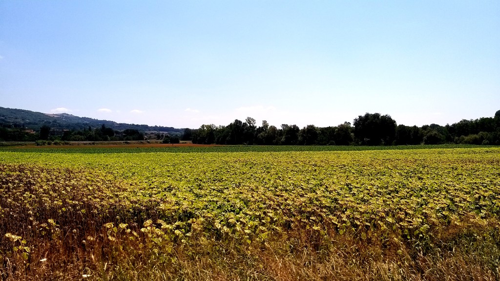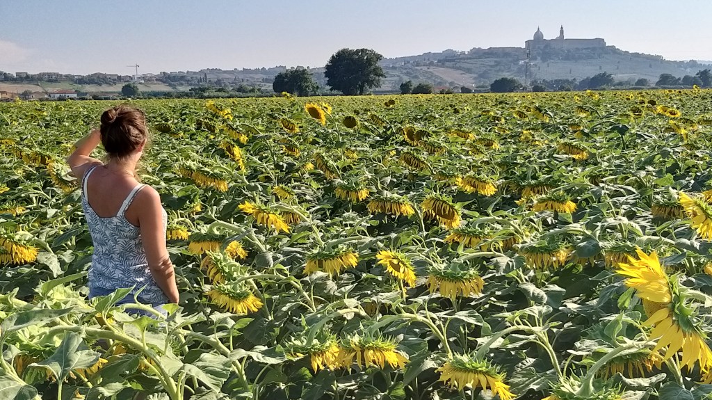 Per tutta una serie di questioni impreviste (ricerca rifornimento con navigatore impazzito, chiacchierata di 40 minuti con venditrice di meloni sulla strada e sessione fotografica tra girasoli morti con lo sfondo del famoso santuario di Loreto), ci abbiamo messo un tempo infinito ad arrivare alla meta prescelta. Quando siamo giunti alla spiaggia del Frate, il sole se ne stava già andando, ma abbiamo potuto comunque godere della pace della spiaggia svuotata e fare un bagno rigenerante alle luci del tramonto.