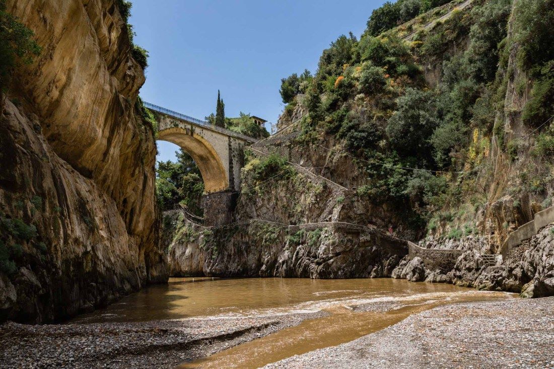 Guardando in alto si scorge proprio il ponte della statale, che forma un arco suggestivo verso il mare. Il torrente Schiato scende dall’altopiano di Agerola e attraversa la spaccatura del Fiordo riversandosi poi nel Tirreno.