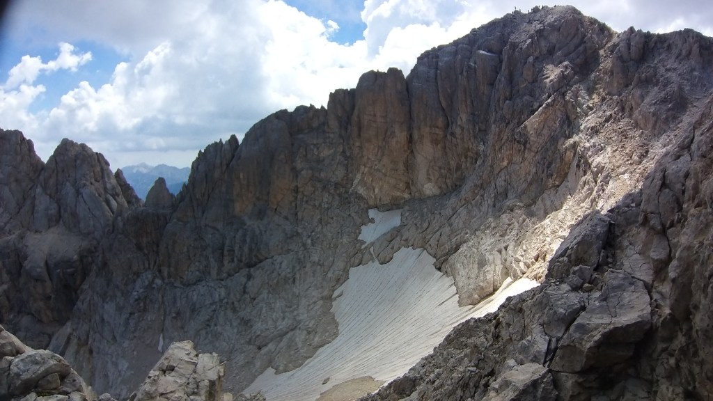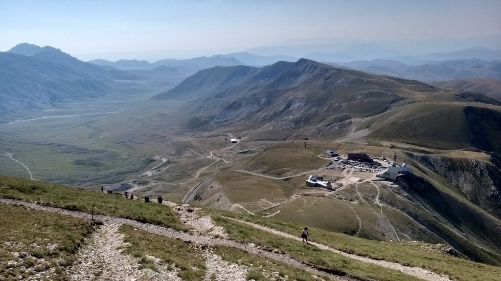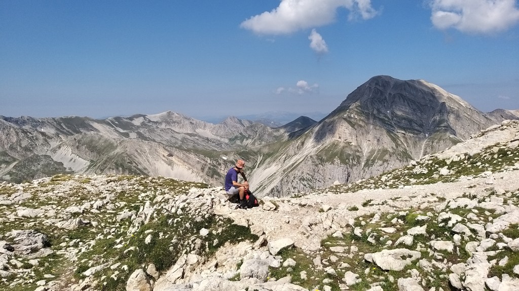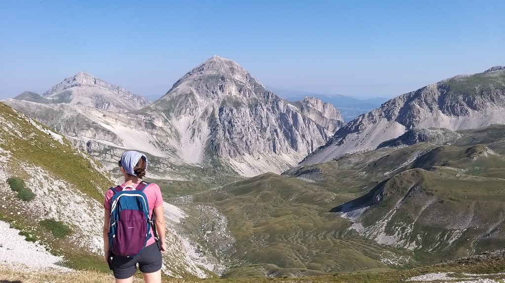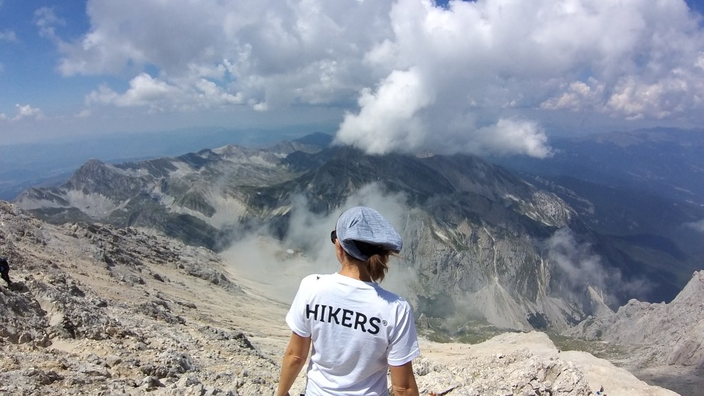 Dopo la salitona rocciosa nel canalone, si arriva quasi in vetta. Da qui già si può scorgere, dall’altro lato della montagna, quel che resta del ghiacciaio del Calderone, unico ghiacciaio dell’Appennino e anche quello più a sud d’ Europa. Ciò che ne restava, in questa calda estate 2022, è davvero poco. Per arrivare alla fatidica croce dei selfie, bisogna farsi coraggio e proseguire lungo una parte in cresta. Il panorama da lassù è davvero incredibile e spazia su Campo Imperatore, sulle cime dell’Appennino centrale e anche, se siete fortunati con il meteo, sul mare.