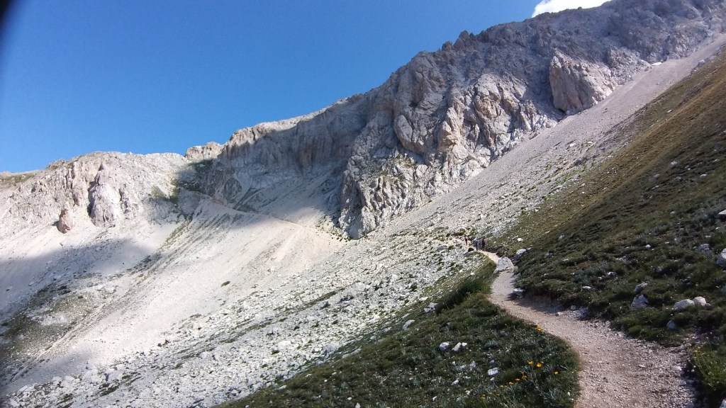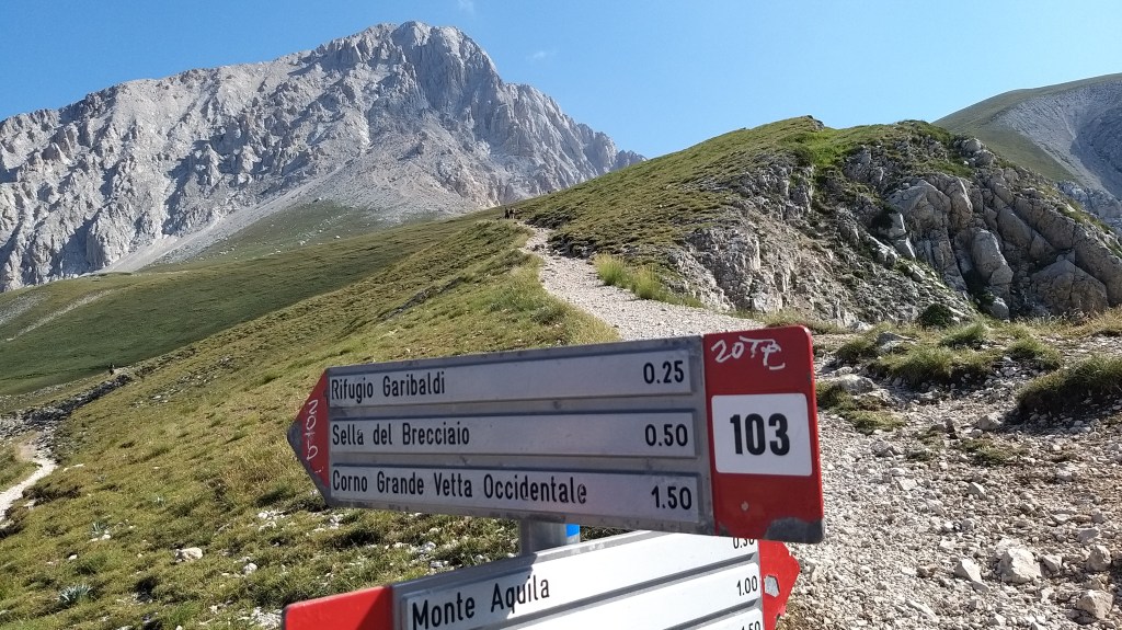 Così abbiamo proseguito, seguendo un cartello che indicava la direzione per raggiungere il Corno Grande attraverso quella che è chiamata la via normale (c’è anche la direttissima, che si percorre in arrampicata) e che indicava in maniera ottimistica due ore di tempo di percorrenza.
