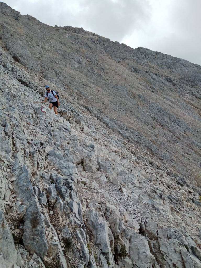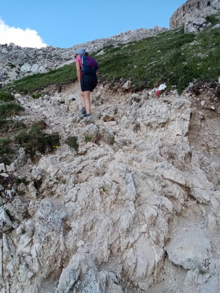 L’ultimo tratto è il più complicato. Si passa per un canalone e bisogna far leva su gambe e braccia per tirarsi su. Ogni tanto dall’alto potrebbe cadere qualche pietra e, come è successo a noi, potreste incontrare macchie di sangue di chi si è fatto male precedentemente. Questo sentiero è segnalato (ma non sui cartelli in loco) come EE, ma senza dubbio avere con sé un caschetto sarebbe una cosa molto furba.