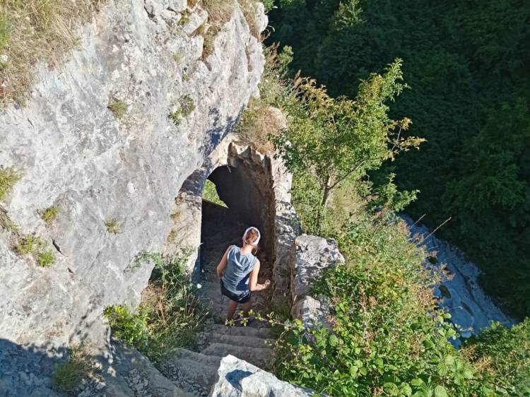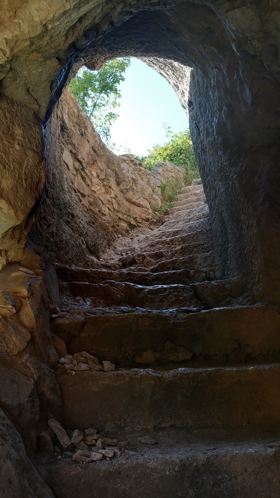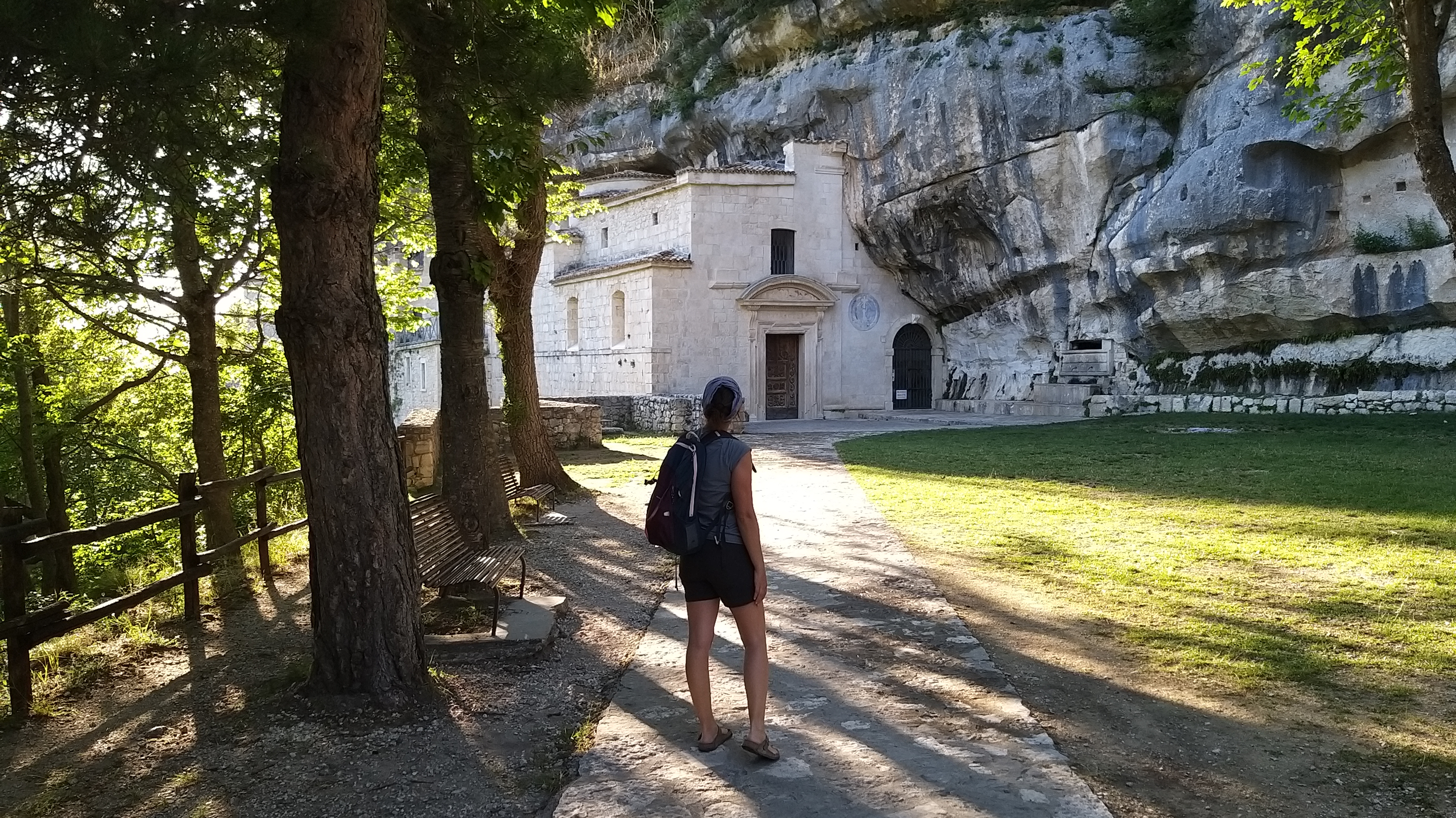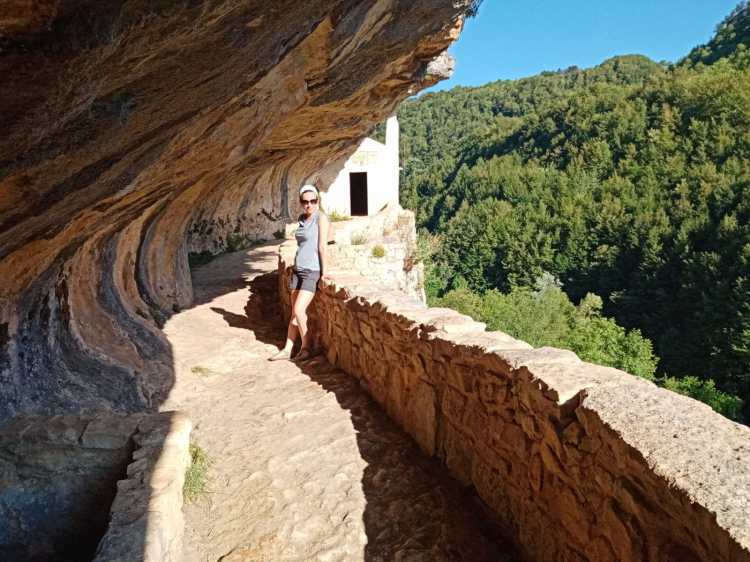 Noi abbiamo scelto la seconda opzione e, dopo aver lasciato la macchina abbastanza abusivamente sulla strada principale (vi è anche la possibilità di usare un parcheggio privato di un signore che ha messo su il business), ci siamo messi in cammino sotto un sole ancora troppo cocente (erano le 17, ma è stata un’estate ribollente). Io avevo i piedi gonfi per la precedente camminata nella Valle dell’Orfento e ho avuto la geniale idea di utilizzare i miei amati sandali Birkenstock. Si può fare, ma meglio avere scarpe adatte alla camminata perché il terreno è abbastanza dismesso e scivoloso, soprattutto all’andata in discesa. Sole a parte, la strada si percorre in circa 40 minuti e il dislivello è minimo (circa 150 m. di dislivello positivo). L’effetto wow quando si arriva è assicurato. Si scende infatti attraverso una scala scavata nella roccia e….ci si ritrova sotto la parete rocciosa che come un’onda di pietra racchiude la balconata e la chiesetta.