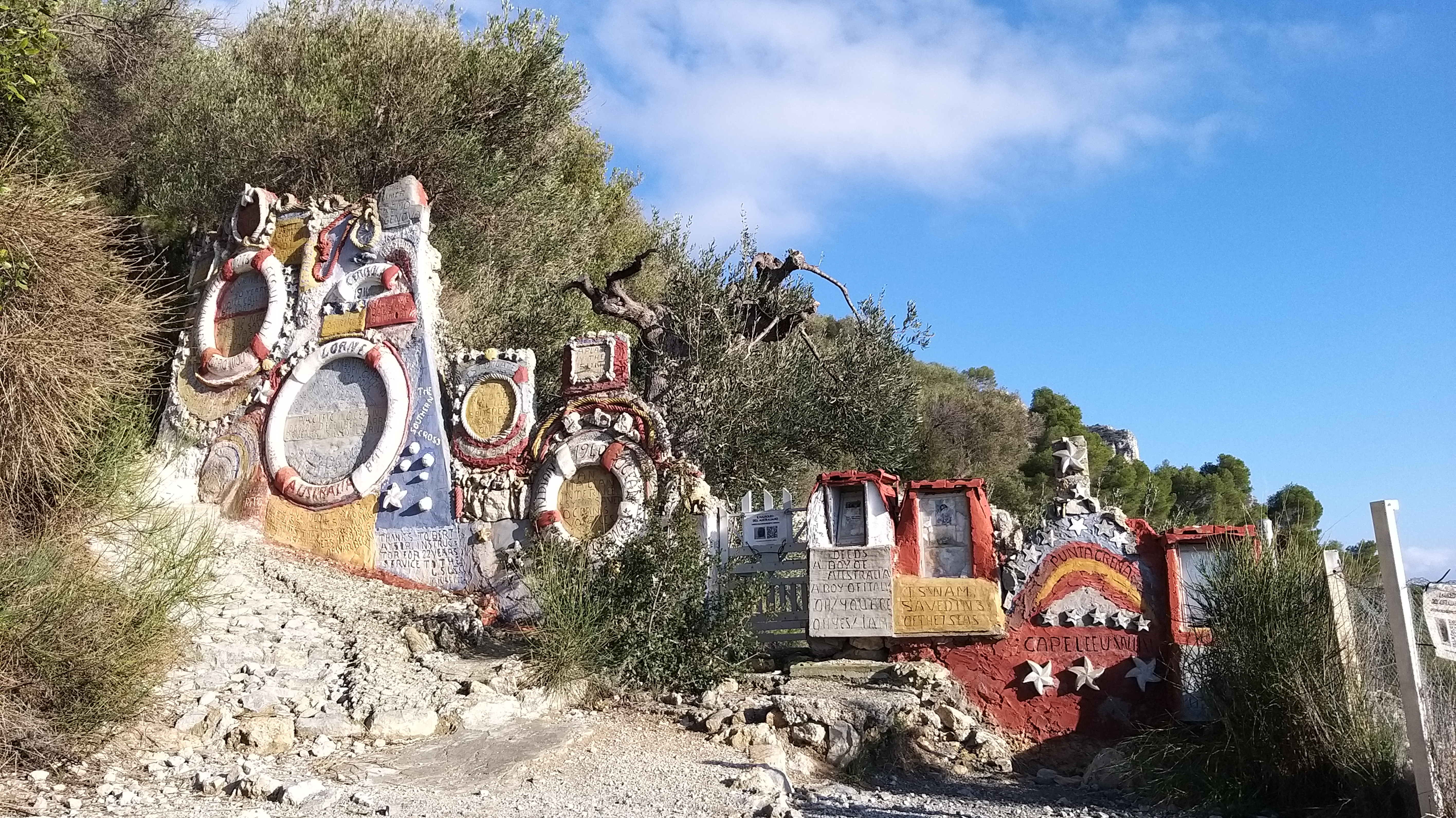 Proseguendo sul Sentiero del Pellegrino, segnalato con una X rossa, si raggiunge il Mausoleo di Giuseppe Cerisola. Era uomo di mare nativo di Varigotti, fatto prigioniero dagli inglesi durante la seconda guerra mondiale e portato in Australia nei campi di lavoro. Il luogo è riconoscibile grazie muretto colorato e decorato a tema marinaresco. Al ritorno nella sua terra natia, dopo 30 anni, Cerisola creò quest’opera in memoria delle persone che aveva salvato in mare, tra cui una salvata dall’annegamento nel 1976 proprio a Varigotti.