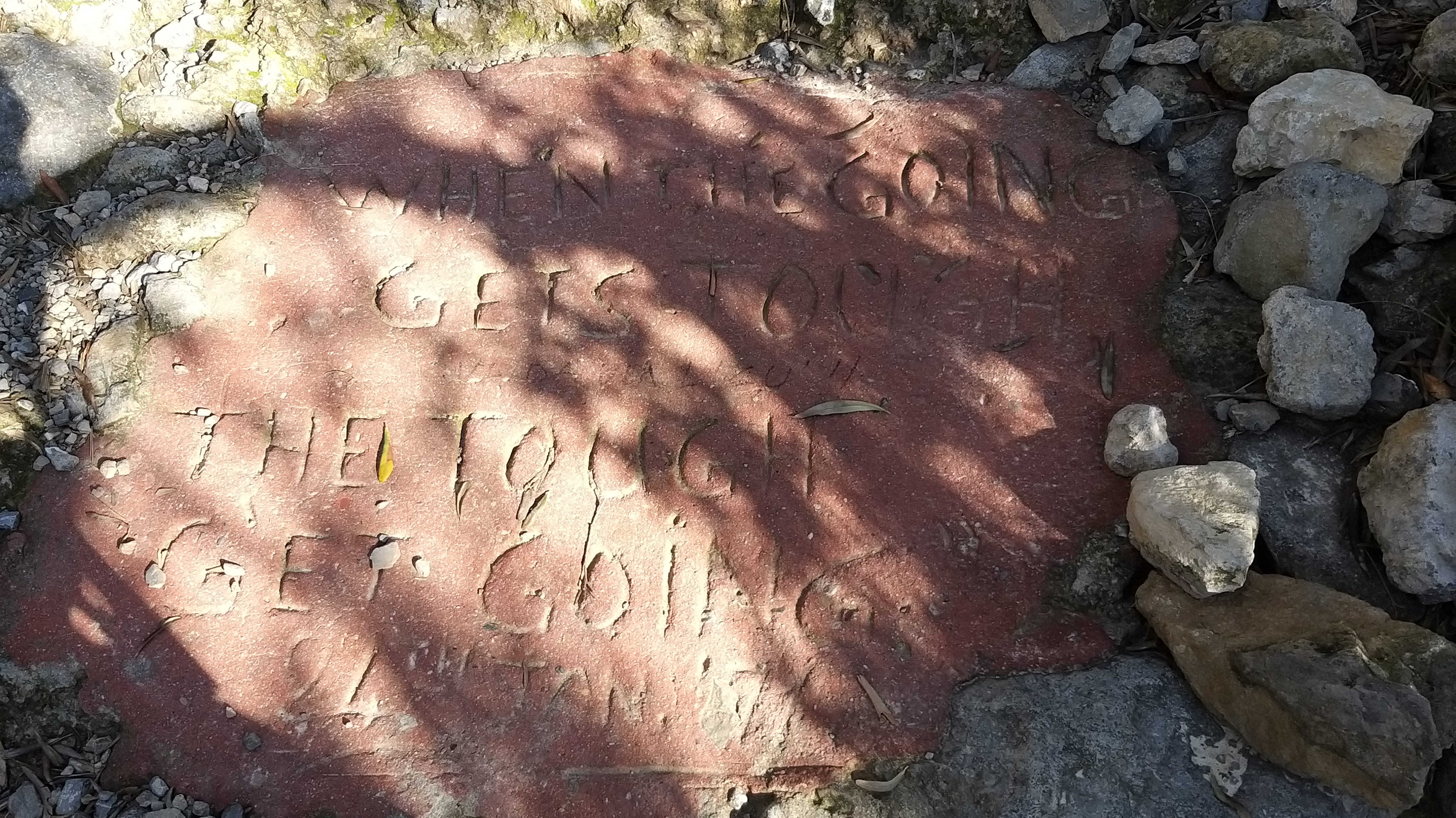 Sul sentiero ciottoloso si scorge una scritta in inglese: “When the going gets tough,
