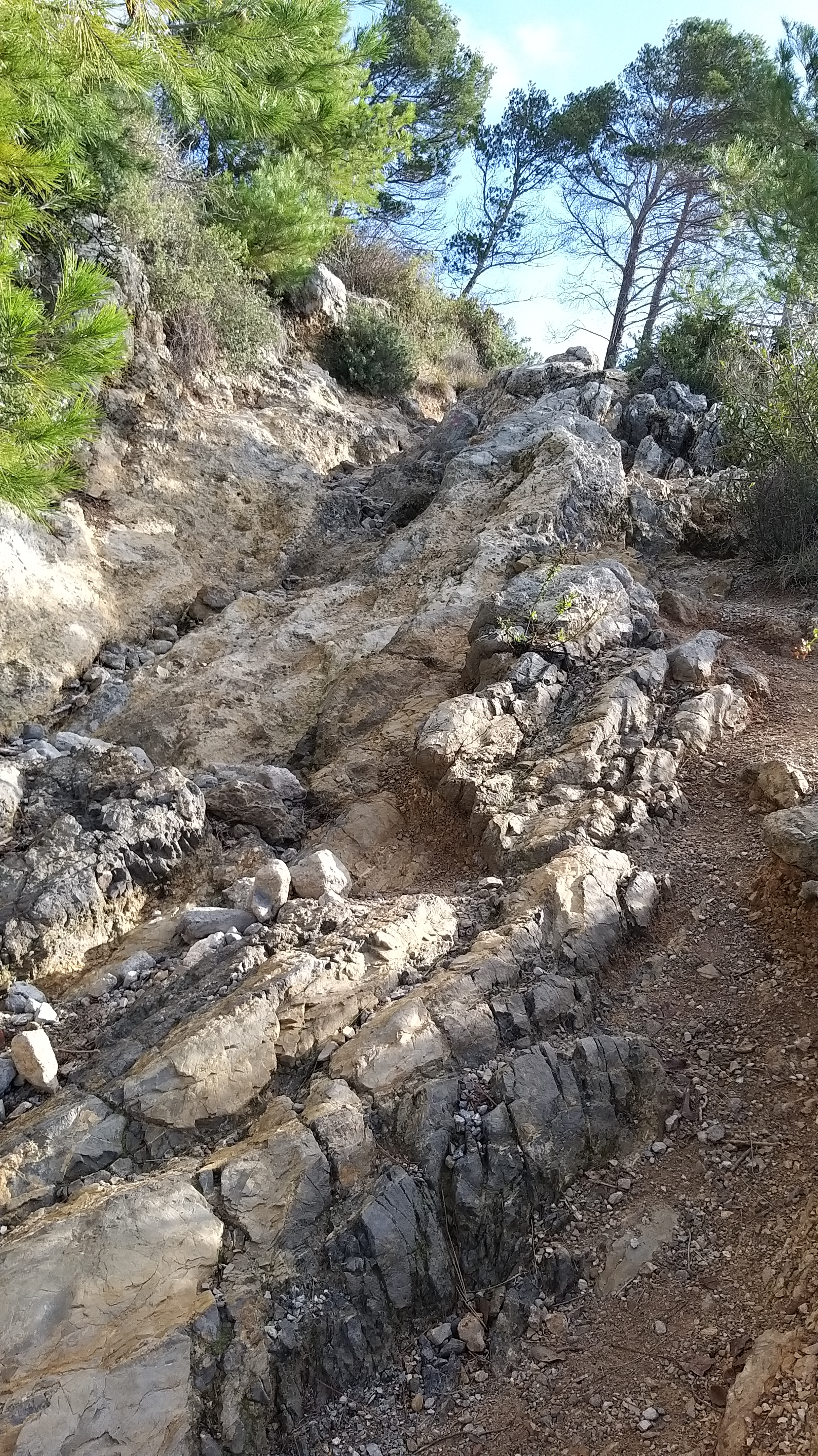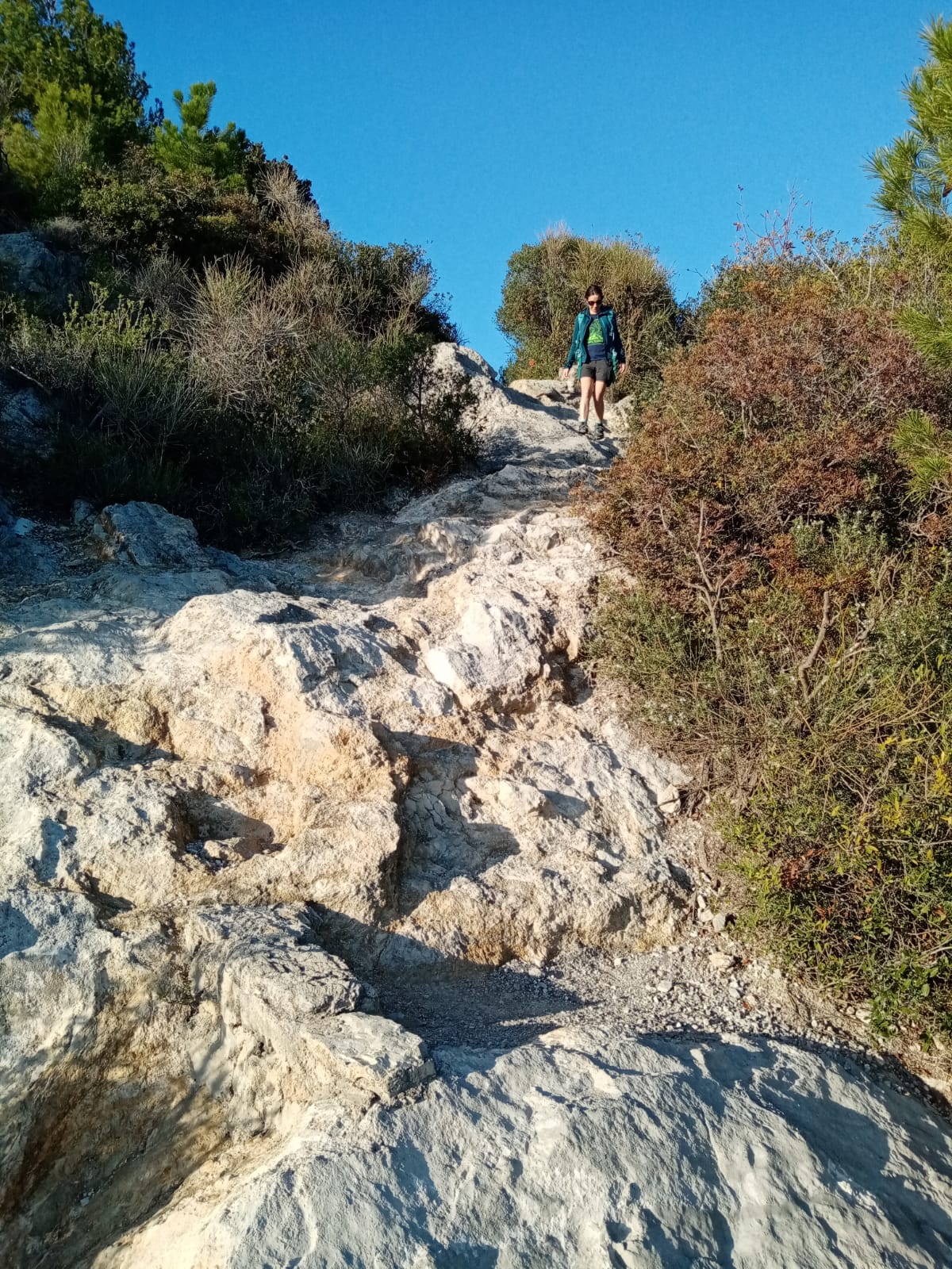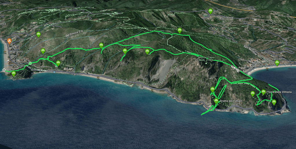 Quando il “sentiero amico per modo di dire” finalmente incontra un bivio, bisogna proseguire verso sinistra (direzione costa), imboccare poi quella che si chiama Strada del Semaforo di Capo Noli e a un certo punto svoltare e riscendere verso il mare, per riprendere il sentiero che si era percorso all’andata e che quindi è facilmente riconoscibile. Essendo in direzione contraria, tutto quel fantastico rock garden incontrato in salita all’andata, si trasforma in una ripida discesa abbastanza “scalinata” e scivolosa.