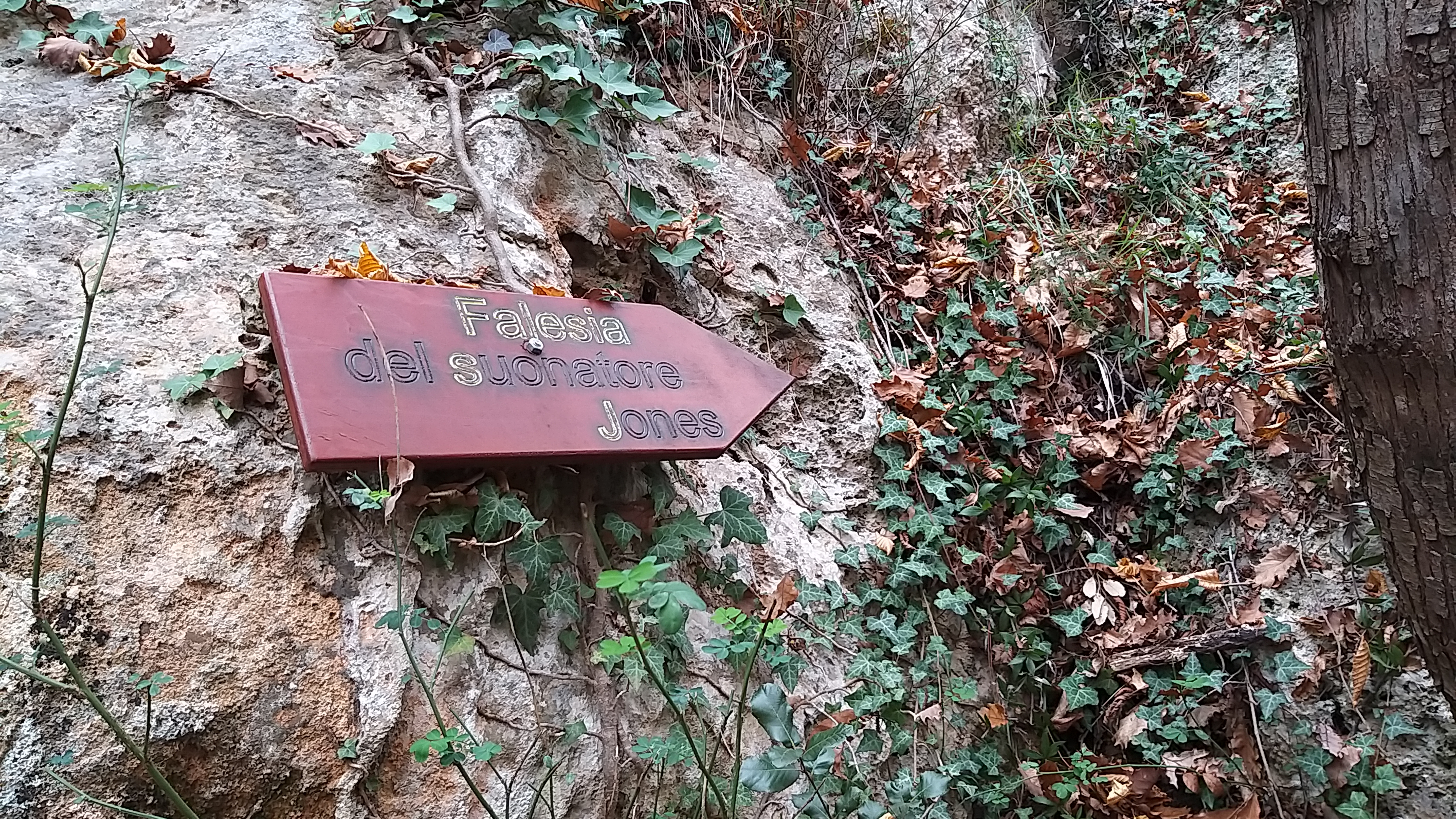 Non abbiamo quindi attraversato il torrente, ma abbiamo proseguito su asfalto fino ad un rudere di una vecchia chiesa. Lì vicino, sulla sinistra, parte un sentiero segnalato con un cartello che dice “Falesia del suonatore Jones” e che sale su ripido nella fitta boscaglia, dove è facilissimo perdersi perché ovviamente la segnaletica è assente. Infatti per un breve tratto anche noi abbiamo perso la traccia e ci siamo trovati a inerpicarci tra arbusti pungenti e fitta vegetazione, manco fossimo impegnati in un’esercitazione militare.