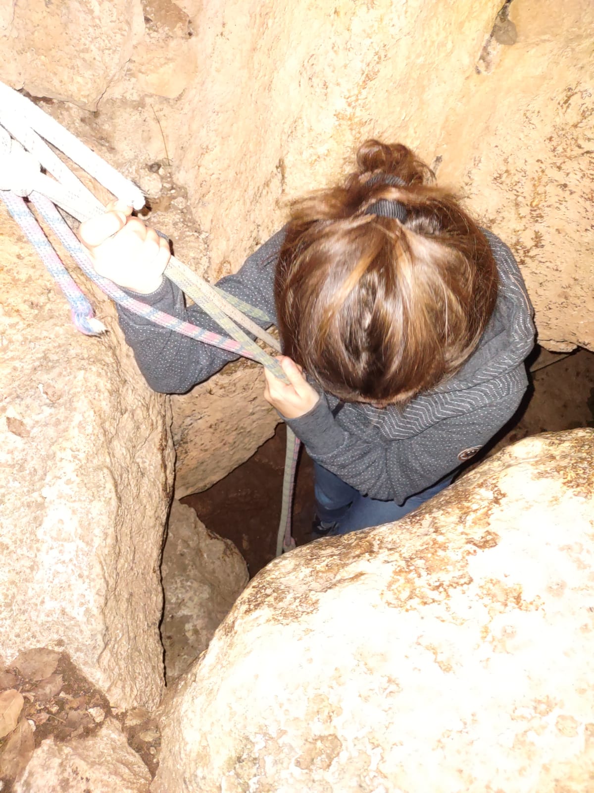 Sembra che la grotta sia raggiungibile da tre diverse altezze, ma ci vuol tutto che noi abbiamo scoperto un ingresso, cioè quello inferiore. Da fuori non si può minimamente immaginare cosa nasconde il cuore della montagna. Si entra in un antro buio dove appunto non di vede niente…ma se ci si addentra più in profondità si scorge una corda che scende da un balzo di roccia. Non serve obbligatoriamente attrezzatura da arrampicata, ma bisogna essere un po’ ginnici e fare attenzione. Aiutandosi con la corda ci si tira su e si risale per circa 15 metri la grossa frana, al buio totale, per arrivare poi a uno stretto passaggio che permette di accedere alla base di una grande sala a cielo aperto. Si tratta di una vera e propria cattedrale di pietra, avvolta dal silenzio che serve agli arrampicatori esperti per riuscire nella loro ascesa. L’effetto wow è assicurato e consola dal nervosismo per la pessima segnaletica ligure.