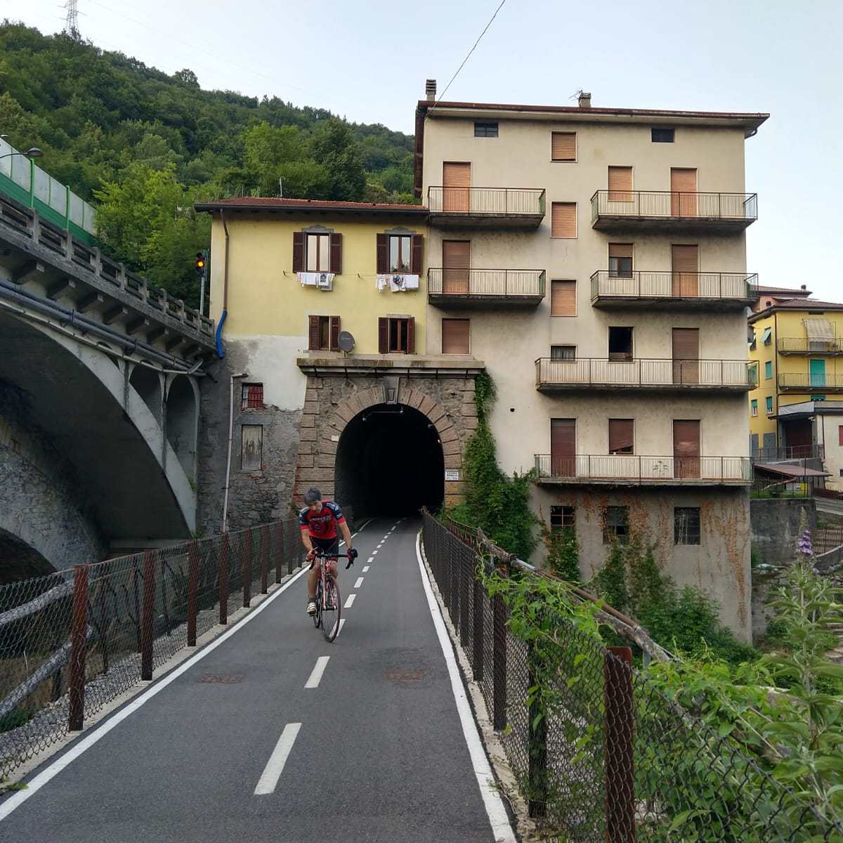 Ufficialmente, la pista ciclabile parte da Almè e arriva fino a Piazza Brembana, ma vi è un unico neo in questo tragitto così ben studiato. Arrivando al centro abitato di Zogno, infatti, si è costretti a percorrere un tratto di circa 1 km lungo la strada statale, che non è proprio il massimo. Per questo motivo, si può optare per una partenza posticipata (così come abbiamo fatto noi anche per motivi organizzativi del momento), imboccando la ciclovia direttamente da Zogno. Il fascino “ferroviario” della prima parte del percorso, da Almé a Zogno, non è però da sottovalutare per la ricca presenza di ponti e gallerie.