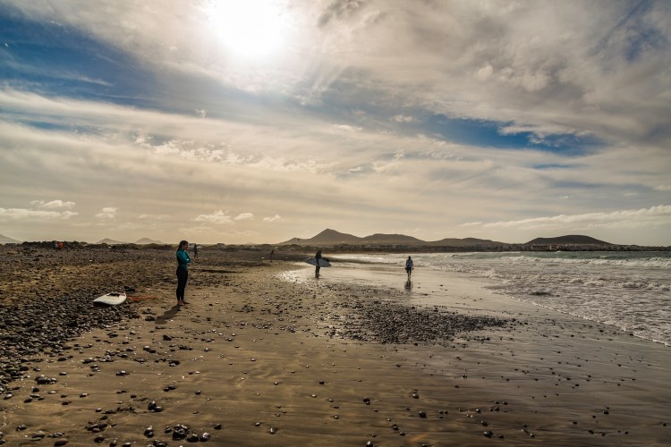 Noi, stanchi dal vento gelido che non ha smesso un attimo di soffiare, ci siamo appollaiati tra alcune rocce e arbusti in cerca di riposo, guardando i surfisti che sfidavano le onde alla luce del tramonto. Restando fermi piano piano siamo stati letteralmente ricoperti di sabbia volante che ci ha fatto definitivamente maledire il vento! Forse la cosa positiva della sua costante presenza è che le sdraio e gli ombrelloni non hanno lunga vita sulle spiagge di Lanzarote, che così restano incontaminate, belle, selvagge…in to the wild!