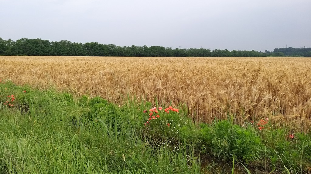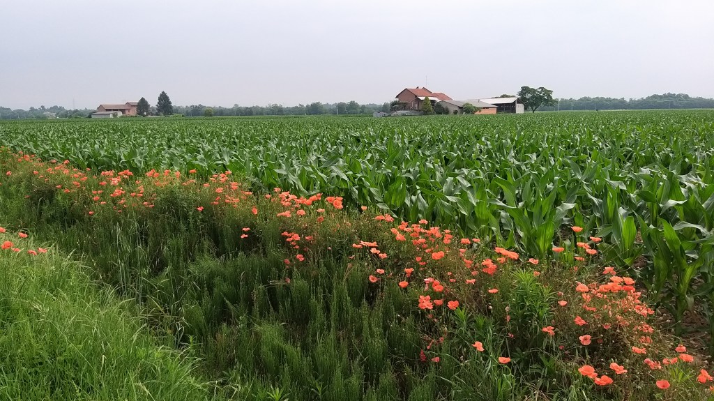 L’oro delle spighe di grano, il rosso dei papaveri, il verde della vegetazione e delle coltivazioni, il rumore dell’acqua dei canali di irrigazione…la prima tappa del Cammino di Oropa della Serra è stata un’esplosione di colori, scaldata dall’umidità dell’estate che fa capolino e bagnata da qualche goccia di pioggia.