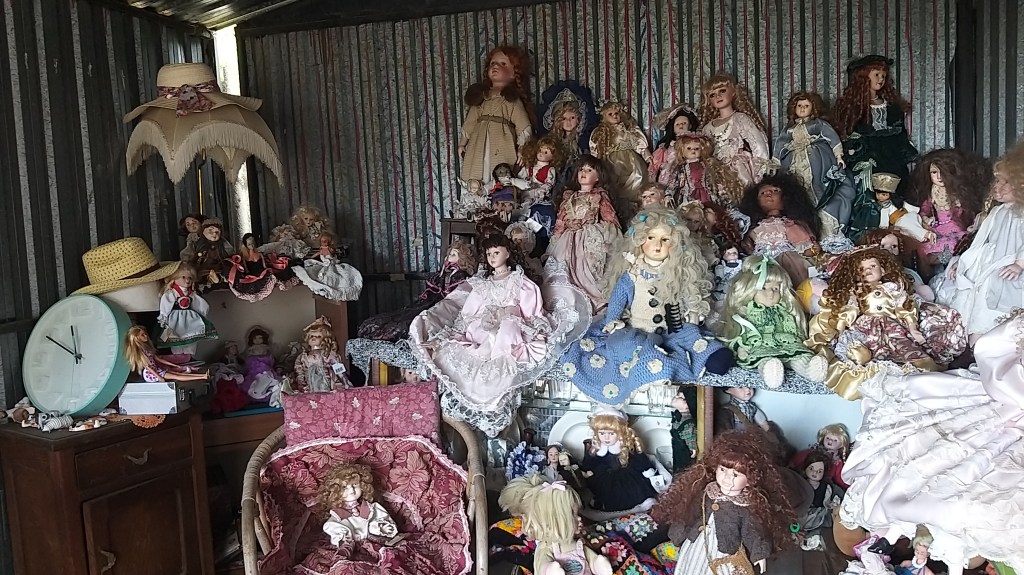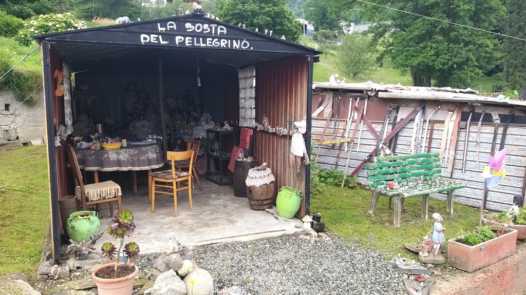 Circa un chilometro prima di arrivare, colta dalla pioggia, mi sono riparata in una particolare sosta del pellegrino dal nome Casa Fiorita, ricolma di bambole, pupazzetti di ogni genere, spaventapasseri e anche qualche dono per i viandanti.