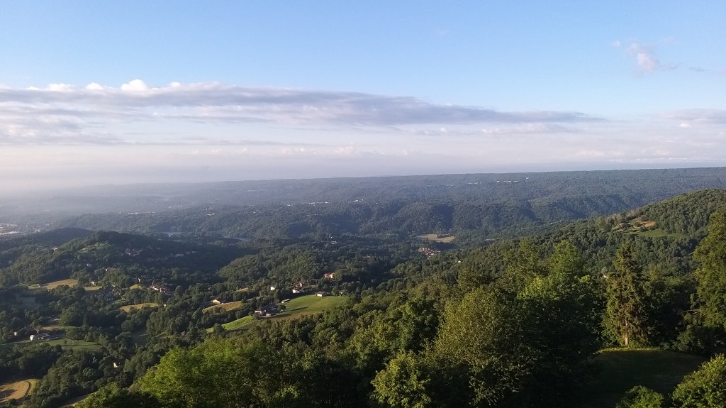 La quarta e ultima tappa è iniziata alle prime luci del giorno. L’obiettivo era arrivare a Oropa in tempo per pranzare con una bella polenta concia. Caffè dalla macchinetta (il martedì è il giorno di chiusura del bar), ultimo sguardo al paesaggio e poi a passo spedito giù per la mulattiera che unisce Graglia al primo centro abitato (e al primo bar) disponibile. Si cammina sul fianco del Mombarone, si attraversa il fiume Elvo e si risale fino al centro storico di Sordevolo, dove ho potuto finalmente fare colazione. Avevo una fame nera e non so per quale motivo mi è stata servita una brioche tagliata a metà, invece che intera (immaginate la mia espressione), quindi poi ho dovuto fare il bis.