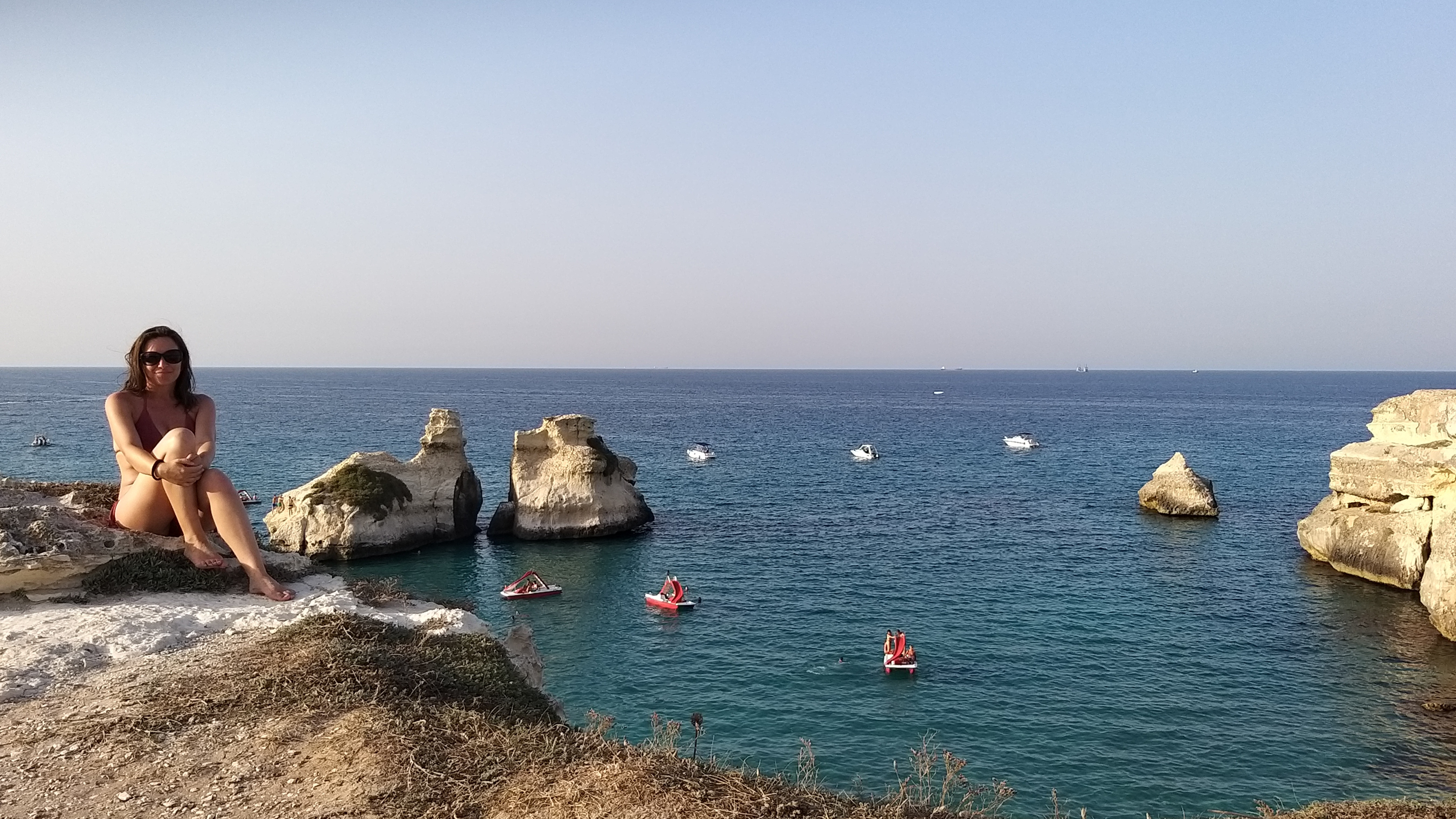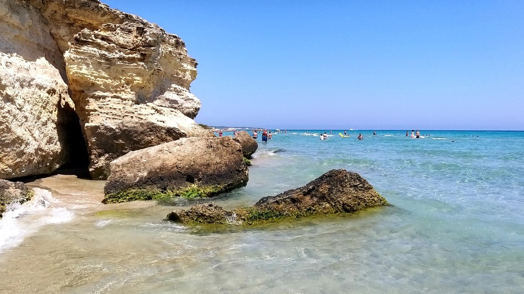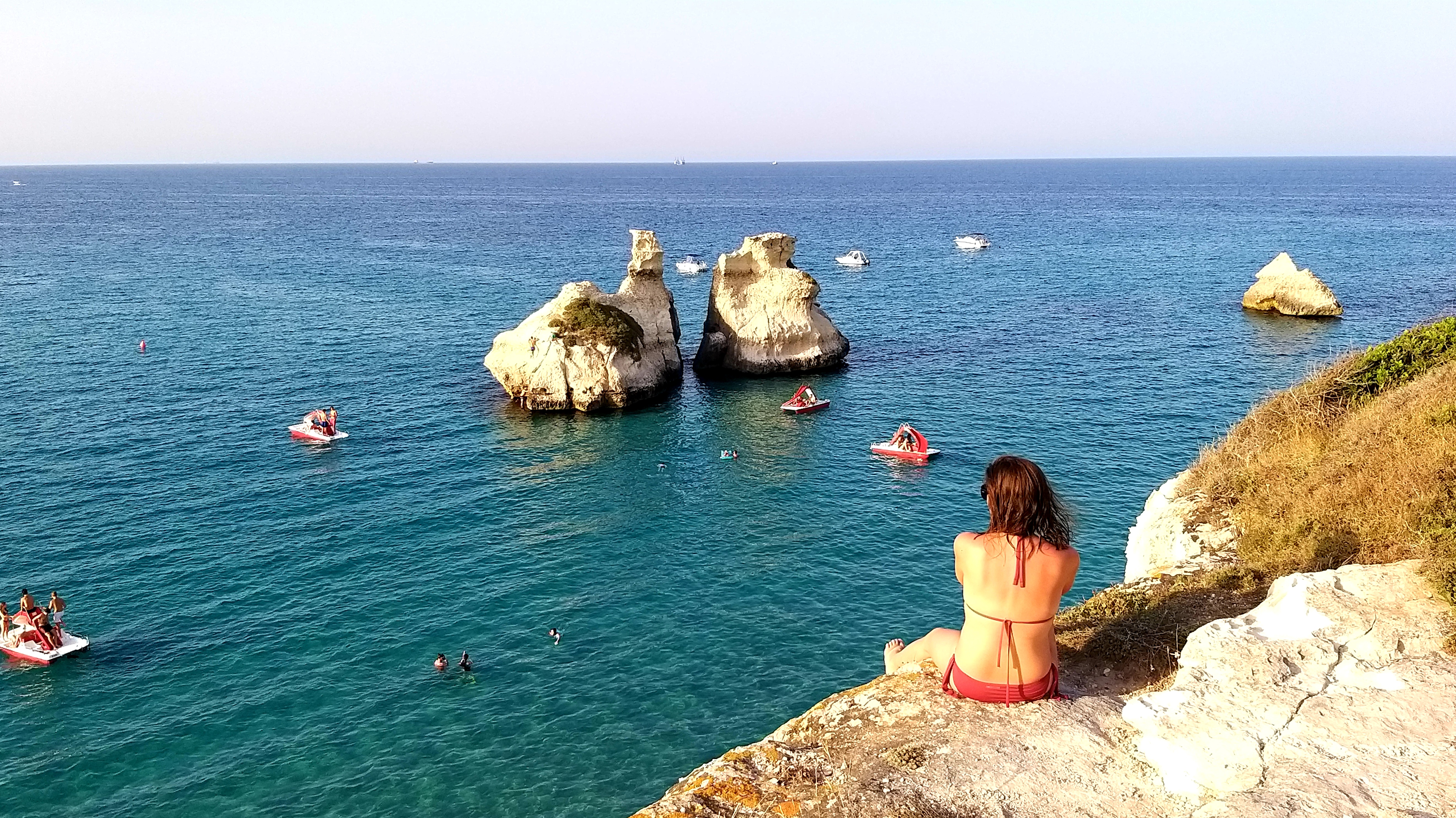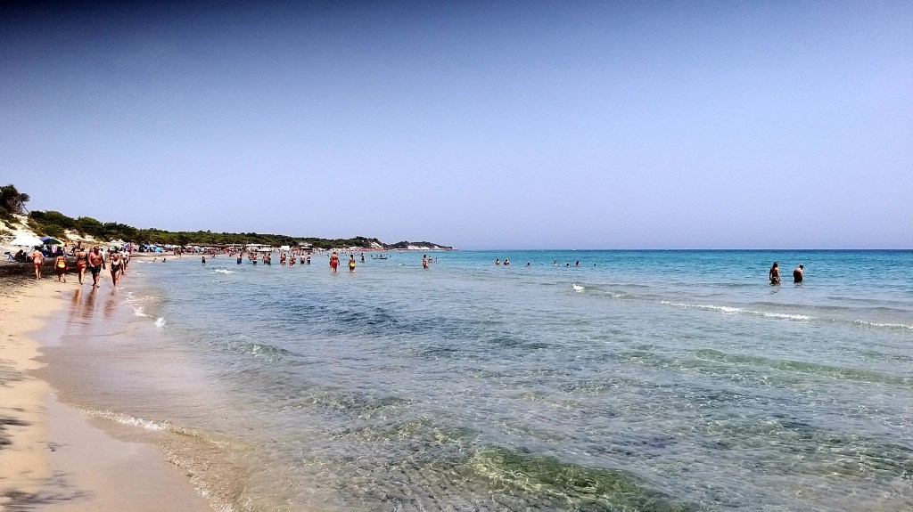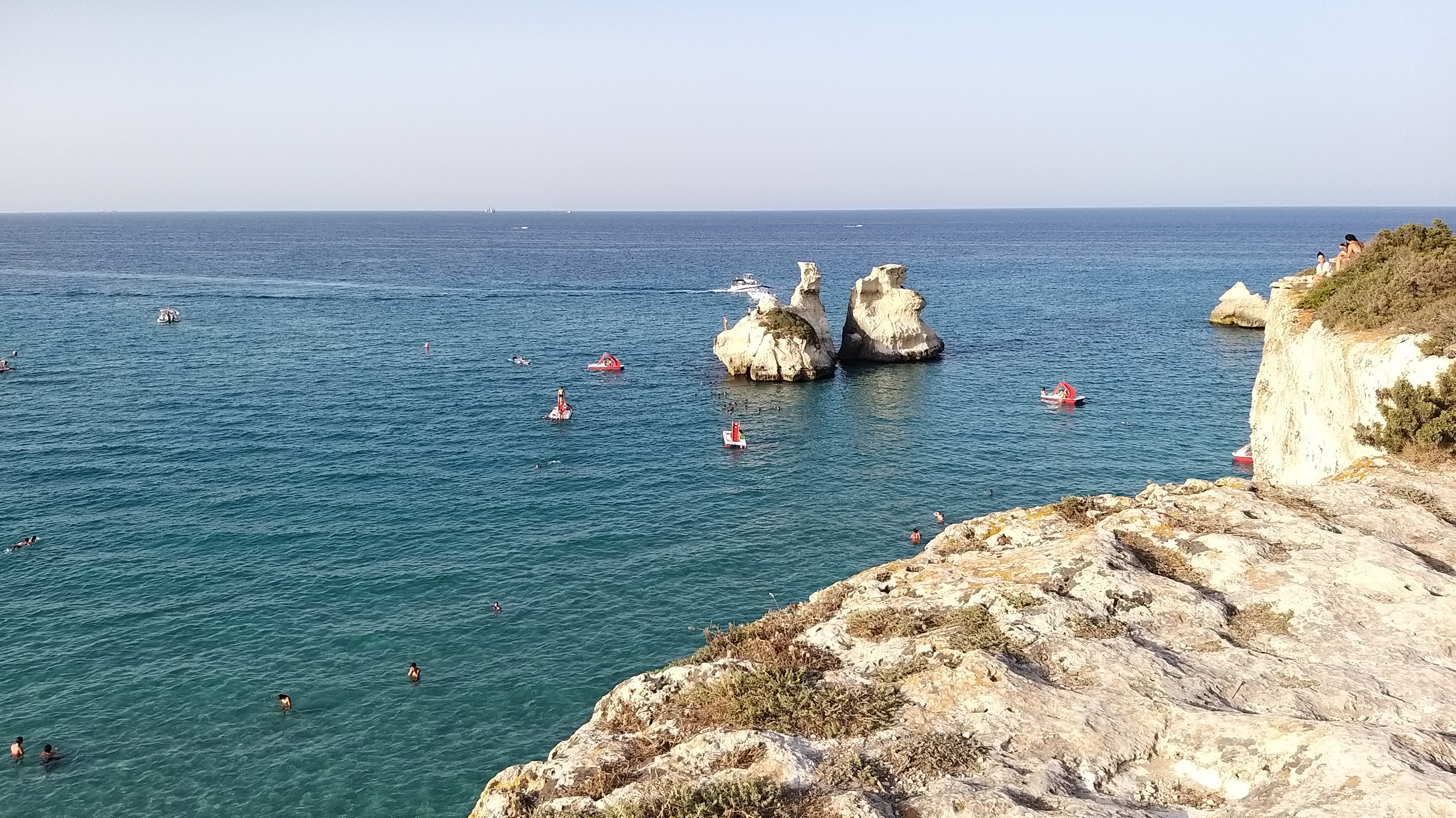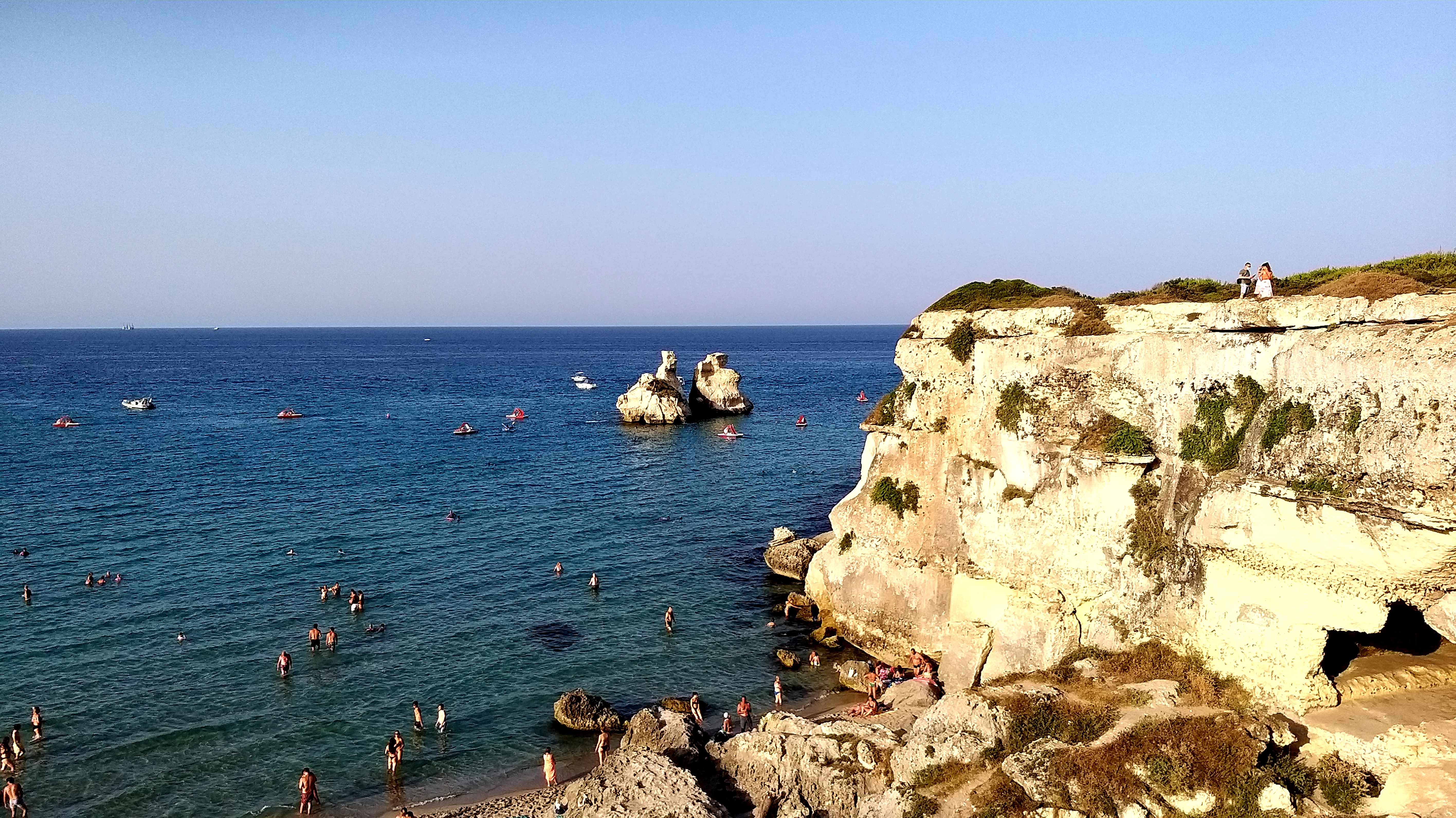 Torre dell’Orso dà il benvenuto ai bagnanti con un’infradito gigante con scritto “I caraibi del Salento”; siamo quindi in una delle tante spiagge definite in questo modo lungo le coste del tacco d’Italia. Torre dell’Orso, nome che probabilmente si riferisce alla presenza di una torre costruita nel XVI secolo, è una località piena zeppa di servizi turistici e balneari, spesso affollati e rumorosi (musica tunz tunz per intenderci) e quindi va bene per quelle persone che non cercano pace, ma divertimento. Al di là dell’eccessiva umanizzazione, la costa rocciosa è bellissima. La spiaggia è racchiusa tra le pareti di una scogliera bianca, sulla quale si può salire per ammirare il panorama dall’alto. Il simbolo di questa località sono Le Due Sorelle, due faraglioni in prossimità dei quali è bello fare il bagno raggiungendoli con i pedalò. Secondo il mito, le divinità trasformarono in roccia i corpi di due sorelle annegate in questo mare. La solita allegria della mitologia.