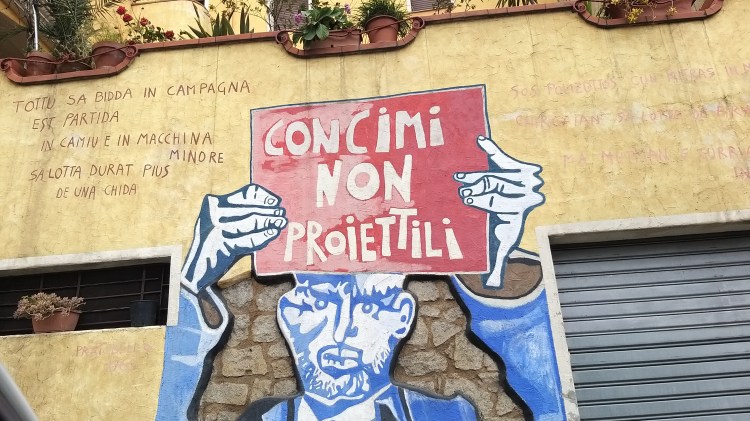 Proprio per questo, il gruppo teatrale anarchico milanese di nome Dioniso, promotore del cosiddetto “teatro di guerriglia”, dopo aver appoggiato la popolazione nella protesta, si stabilì a Orgosolo per qualche anno. Prima di andarsene, lasciò un murale (nella foto di seguito) di cui il messaggio era all’incirca: vale più il capitalismo o la popolazione? Di chi è la Sardegna?