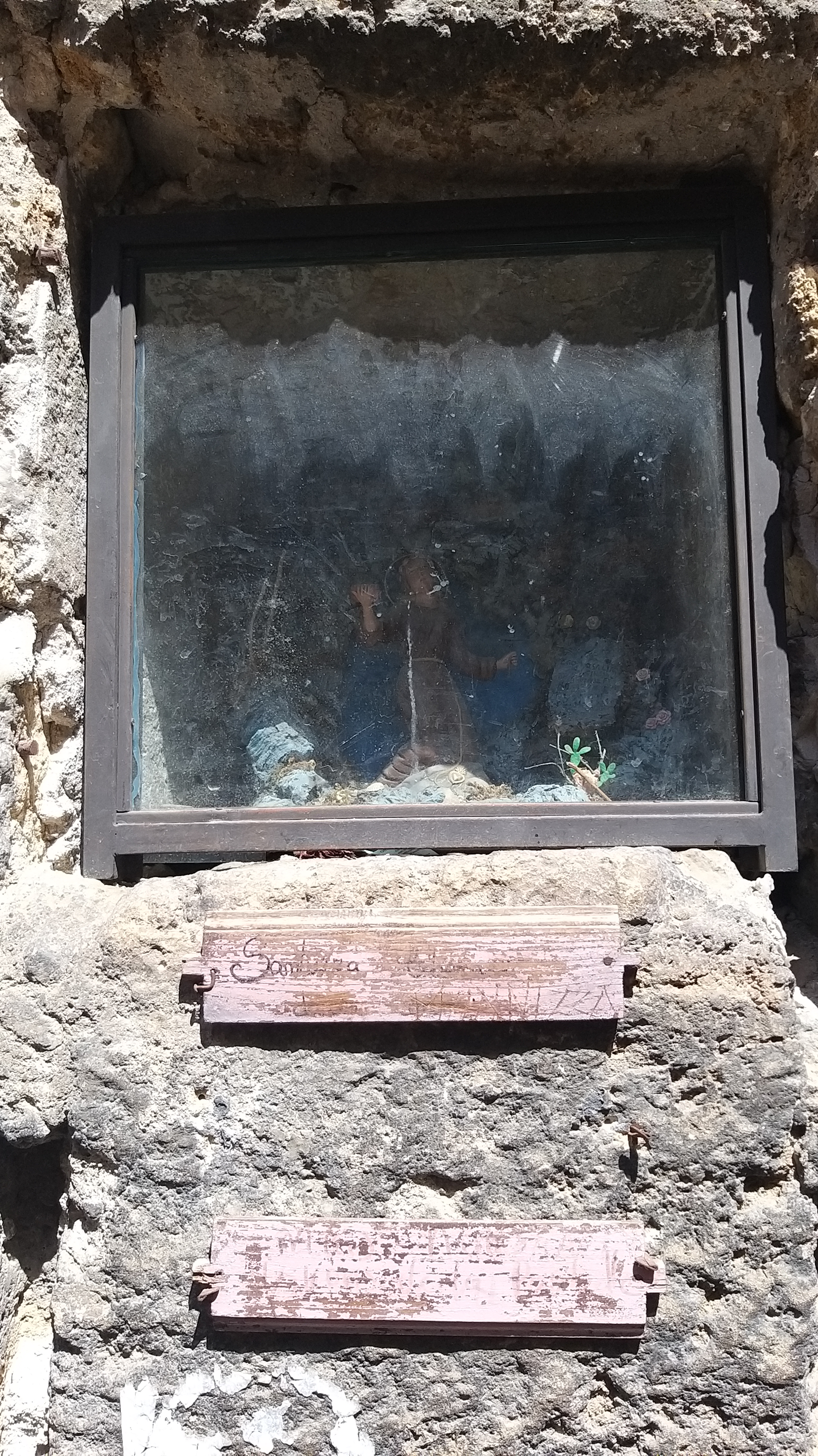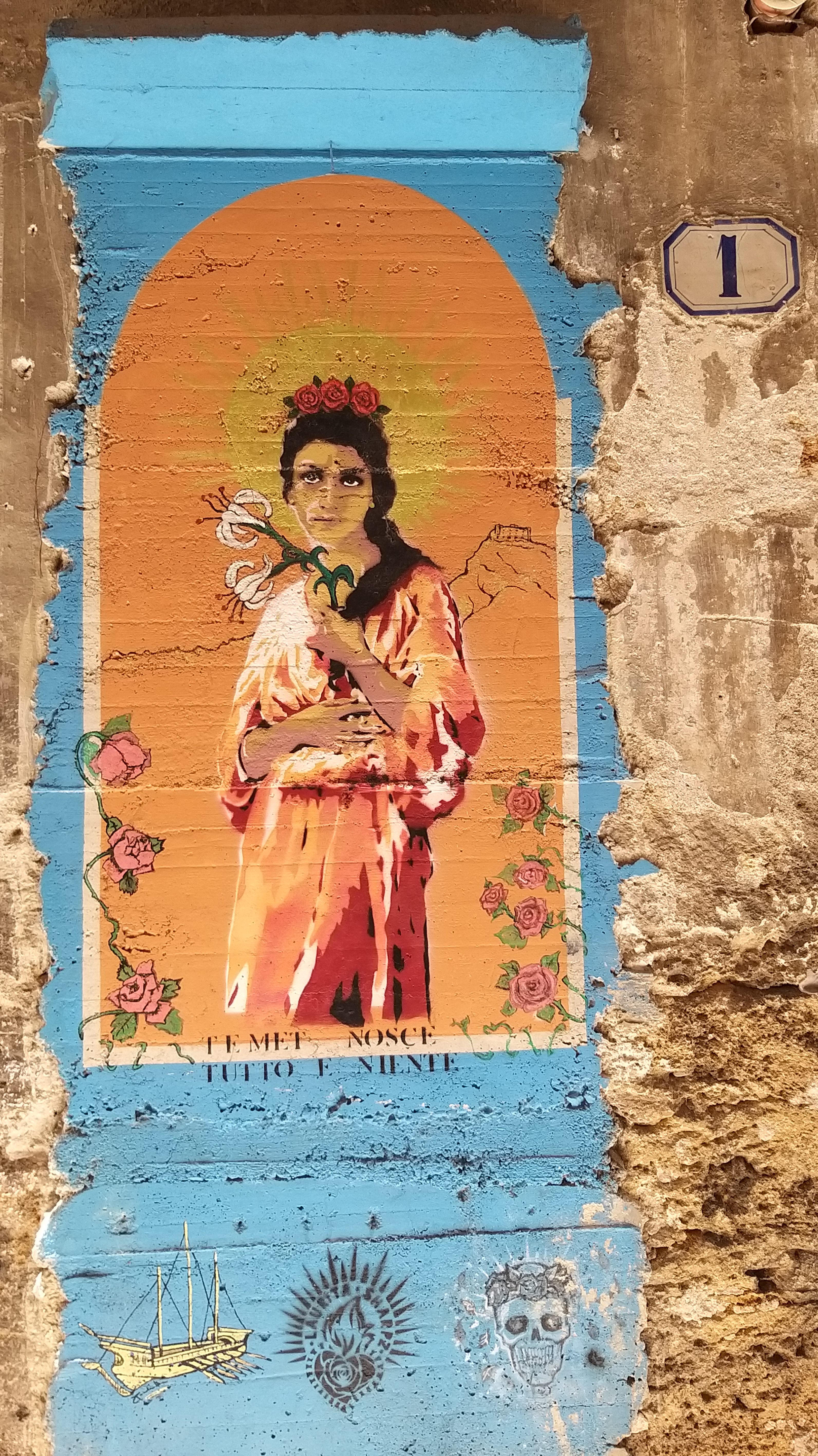 In una piccola viuzza ai margini del mercato, che pare fosse sempre sommersa da cumuli di rifiuti, è apparsa in una teca abbastanza rozza una Santuzza particolare: su una tavoletta di legno tutta rovinata si legge “Santuzza, liberaci dalla munnizza”. Pare abbia funzionato.