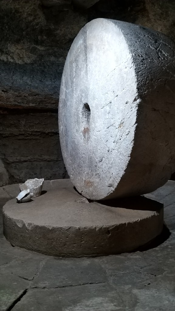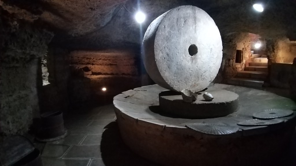 Inutile dire che il lavoro in questi frantoi era durissimo ed estenuante; solitamente veniva svolto da marinai, poiché erano abituati a vivere in ambienti stretti. Condividevano lo spazio e la vita con gli asini o i muli, che mettevano in moto la macina per la molitura, e uscivano di rado. Nella roccia erano ricavate anche delle “cuccette” nelle quali potevano riposare a turno. Ma perché, vi chiederete, i frantoi venivano scavati sotto terra invece che costruiti al di sopra? Principalmente perché era più economico ricavare un ambiente scavando; tra l’altro la tradizione di scavarli nella roccia è molto antica e si fa risalire ai monaci greci, i primi che introdussero in questi luoghi la coltivazione della vite e dell’oliva. Un secondo motivo è una questione di microclima: la temperatura costante delle grotte, intorno ai 18 gradi, impediva alle olive di ammuffire o di rovinarsi a causa degli sbalzi di temperatura.
