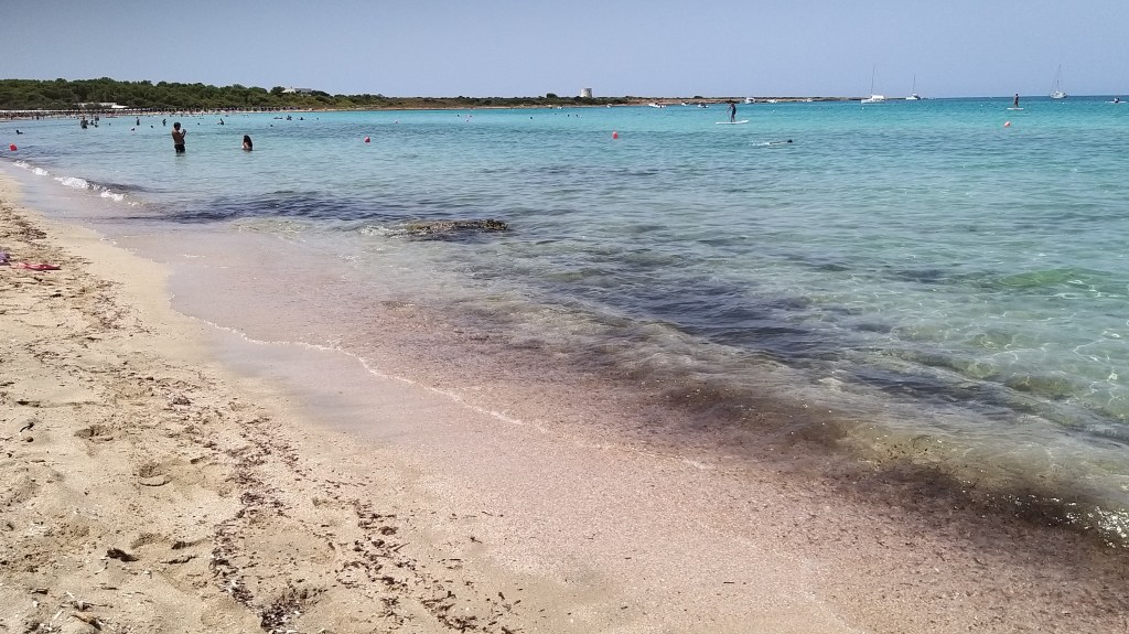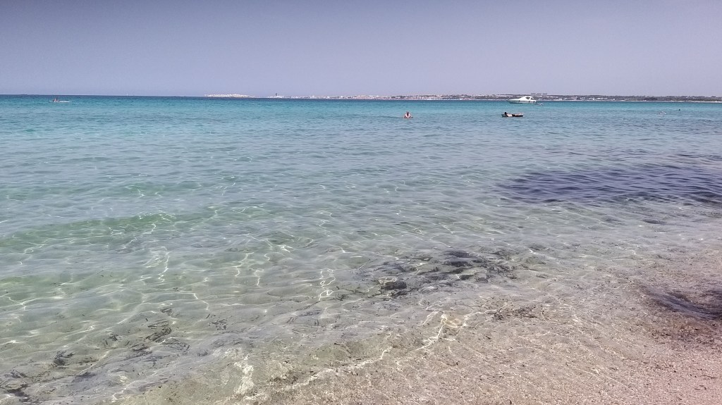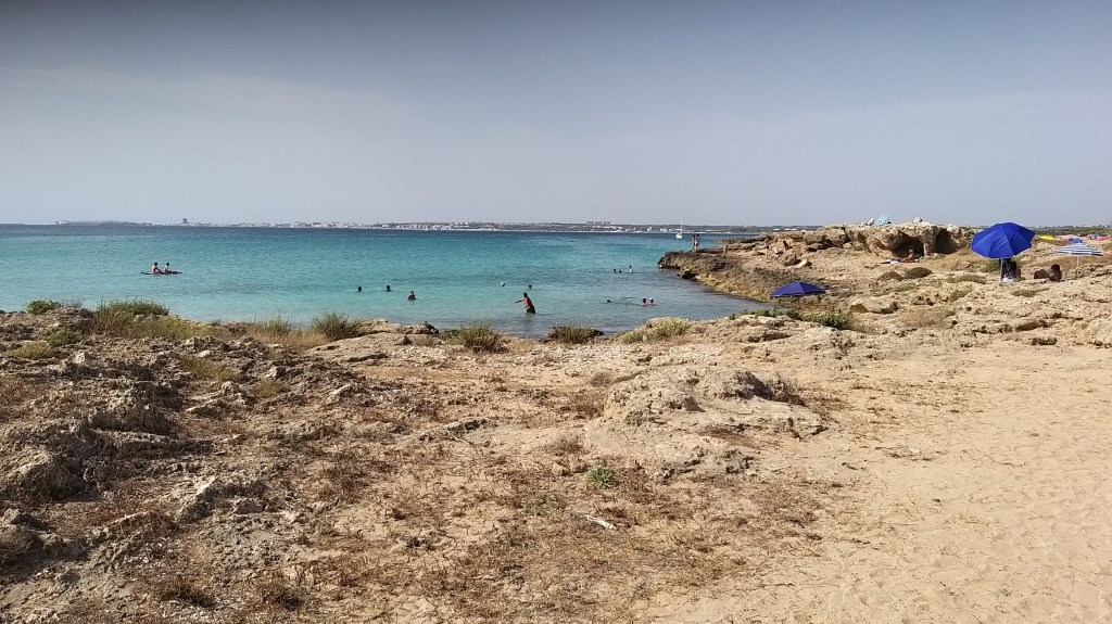 Facciamo il giro del tacco dello stivale a Santa Maria di Leuca e risaliamo verso nord. La prima rinomata spiaggia che si incontra è quella di Pescoluse, chiamata la Maldive del Salento. Sabbia bianca finissima, fondali bassi, mare trasparente. E che vuoi di più? Adesso mi dovete scusare, ma io qui non sono proprio riuscita a fermarmi: nonostante l’ampia spiaggia, c’era talmente tanta gente, tra stabilimenti balneari e libera, che neanche si riusciva a vedere dove si calpestava terra. Invivibile. Ma sono certa che senza questo eccesso di umanità sarà di certo un luogo incantevole.