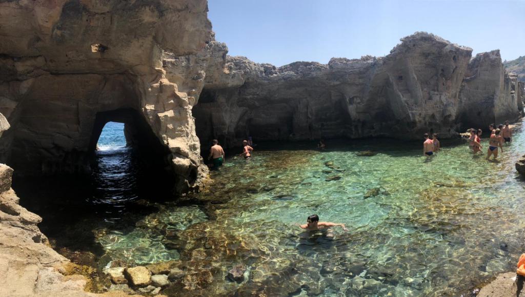 Spiaggia della Grotta Verde La Grotta Verde è senza dubbio il luogo più straordinario che ho visto in questo viaggio. Si trova a Marina di Andrano, a sud di Castro, e si presenta a primo sguardo come un posto che non ha niente di eccezionale: solo mare e scomode rocce appuntite. Però, se ci si ti tuffa e ci si addentra nella grotta, nonostante gli stretti passaggi e il buio…si va incontro a un vero e proprio spettacolo della natura. Sotto la parete rocciosa, quasi completamente chiusa, c’è una sorta di piscina naturale. Le aperture della roccia che ci sono sul fondo, fanno sì che la luce del sole riesca in parte ad entrare: riflettendosi sull’acqua presente all’interno, di colore verde e cobalto, viene proiettata una luce verde sulle pareti interne della grotta. Si resta davvero a bocca aperta e risulta impossibile rendere l’effetto in una foto. Attenzione però, per vedere questo gioco di luci e colori, bisogna andare nella grotta al mattino.